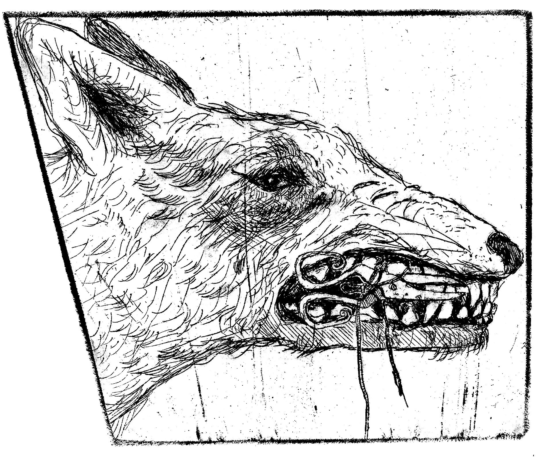 Ces gravures font partie de l’ouvrage Des ciseaux dans le désert, livre d’artiste fabriqué par Ravachel et publié à compte d’auteur en 2024. Ces eaux-fortes sont l’interprétation d’une nouvelle particulièrement bizarre, d’un homme particulièrement bizarre : Chacals et Arabes de Franz Kafka.